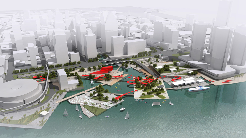 “Breaking the Edge” is intended to be a catalyst, rather than seen as a finalized plan. The goal of our design is to reenergize the social fabric of the downtown waterfront through a network of connected multifaceted spaces from Campus Martius to the Riverwalk; as well as, enhance existing urban assets to create an accessible destination as part of a new vibrant downtown Detroit. We do not view this as an abandonment of Hart Plaza, but rather as reclamation of the Detroit Riverfront by the city. Our strategy combines the specificity of an architectural intervention with programmatic choreography; thus, orchestrating the dynamic coexistence of urban activity and stimulating the urban potential of the riverfront through a connected public space. This orchestration is initiated through the daylighting of the historic Savoyard River and channeling the newly uncovered waterway to the Detroit River through the introduction of the new Savoyard Canal. The restoration of the hydrologic system in Detroit and the introduction of a constructed wetland will serve both environmental and social purposes as the new canal runs along lower Woodward Avenue, enhancing the Downtown experiential quality and creating an attractive environment for new businesses at both the street and lower promenade levels. The canal is flanked by programmed promenades on either side, directly connecting the current center of activity with newly programmed islands at the river’s edge. This new pedestrian connection from Campus Martius to the riverfront will be unobstructed by traffic along the sunken promenades and under the new Jefferson Avenue Overpass.