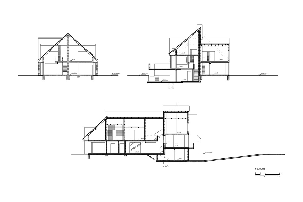 The exposed party wall emphasizes the length and the division of the building along its center axis. The exterior walls of the ground floor with their exposed block walls minimally define the first floor common areas. The living rooms, the dining area and the kitchen, with ample light, have direct access to the exterior through generous sliding doors.