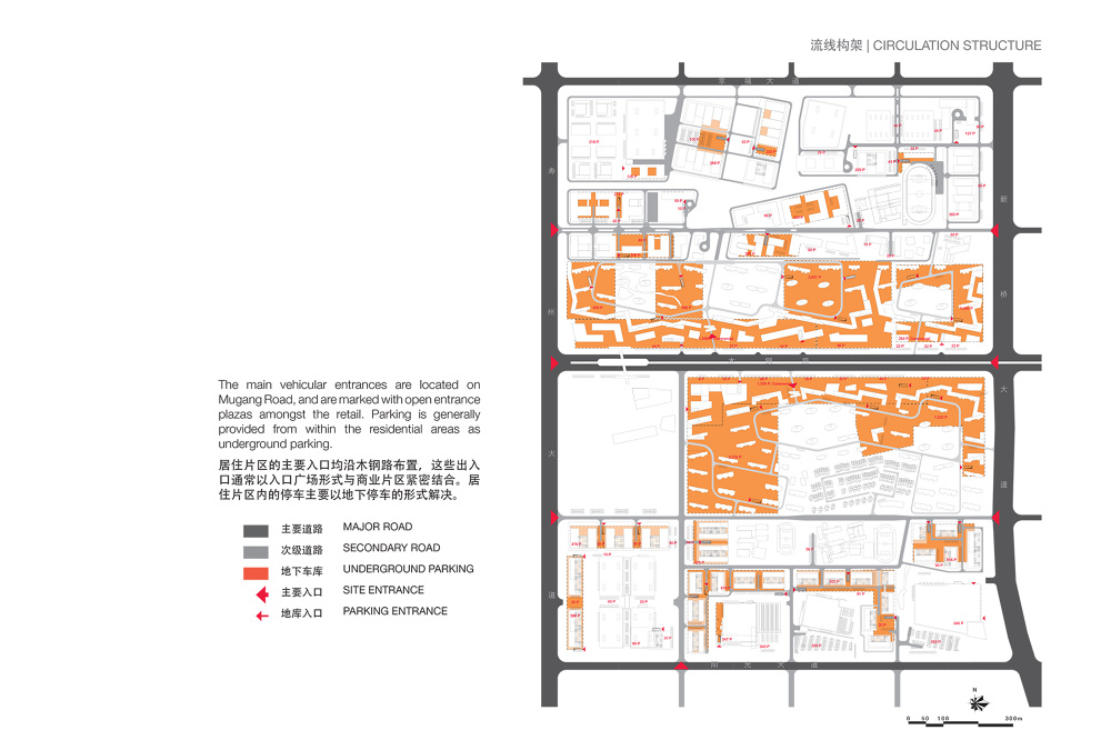 The central areas north and south of Mugang Road are primarily residential areas, with retail along Mugang Road . Two 120m (390ft) high commercial towers form recognizable landmarks near the light rail station, with a larger concentration of retail. Both residential areas are composed as a series of connected green spaces and small parks, surrounded by high rise and midrise residential towers, each boasting high end oval towers in their respective centers. The main vehicular entrances are located on Mugang Road and are marked with open entrance plazas amongst the retail. Parking is generally provided from within the residential areas as underground parking. The central parks are designed as environmentally active zones for the mitigation of storm water occurrences and to filter the rainwater into wetland areas.